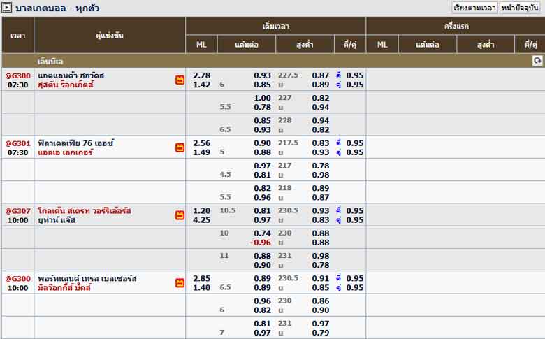ราคาของบาสเกตบอลมักเน้นไปที่รูปแบบแต้มต่อ (Point Spread) และการทายผลสูงต่ำ (Over/Under) โดยแต้มต่อในบาสเกตบอลจะมีความละเอียดกว่า เนื่องจากผลคะแนนของบาสเกตบอลมักมีตัวเลขที่สูง เช่น ต่อ 6.5 หรือ 9.5 แต้ม